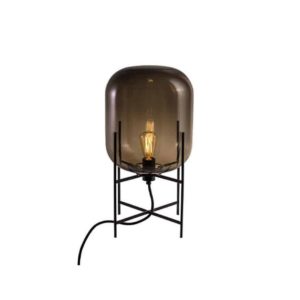 Lámpara de piso Compass Cattelan Italia con estructura en nogal canaletto o roble quemado y acero pintado grafito mate. Pantalla en cristal transparente. Hilo rojo. Las burbujas y las irregularidades de la esfera son peculiaridades del procesamiento del vidrio soplado.
